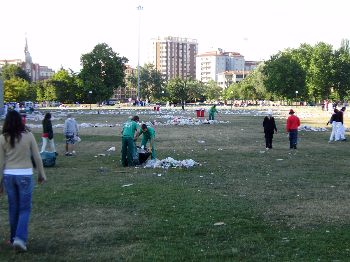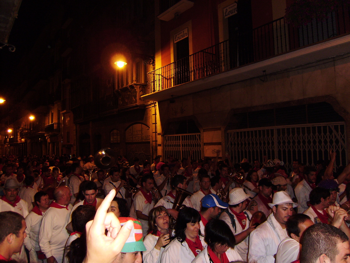 21:00 – Arrivé à Pampelune. Ce qui est impressionnant dès l’arrivée c’est le nombre personnes habillées en rouge et blanc et surtout que cela touche toutes les tranches d’âges, du nourrisson dans la poussette jusqu’au couple de personnes âgées. Deuxième choc, le volume d’ordures disséminées dans tous les coins de la villes mais finalement, on se rend rapidement compte que cela n’est rien quand on voit le nombre de viandes saoules fêtards qui font la fête dans les rues.